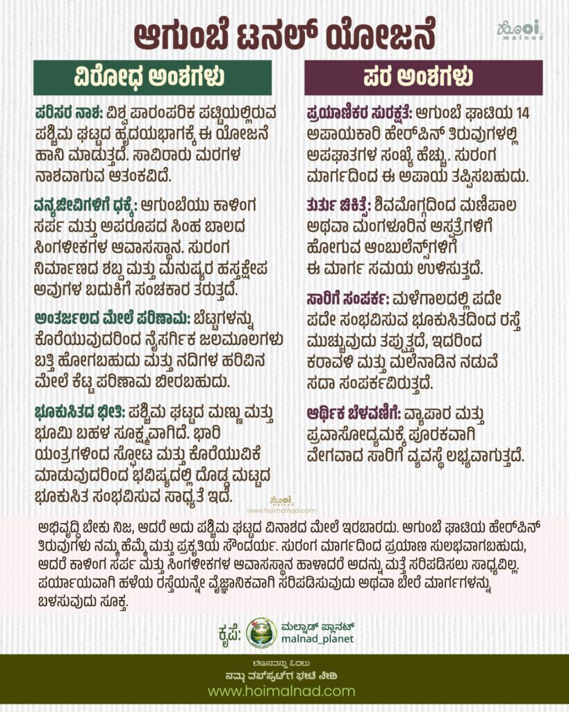 - ವನ್ಯಜೀವಿಗಳಿಗೆ ಧಕ್ಕೆ: ಆಗುಂಬೆಯು ಕಾಳಿಂಗ ಸರ್ಪ ಮತ್ತು ಅಪರೂಪದ ಸಿಂಹ ಬಾಲದ ಸಿಂಗಳೀಕಗಳ ಆವಾಸಸ್ಥಾನ. ಸುರಂಗ ನಿರ್ಮಾಣದ ಶಬ್ದ ಮತ್ತು ಮನುಷ್ಯರ ಹಸ್ತಕ್ಷೇಪ ಅವುಗಳ ಬದುಕಿಗೆ ಸಂಚಕಾರ ತರುತ್ತದೆ.