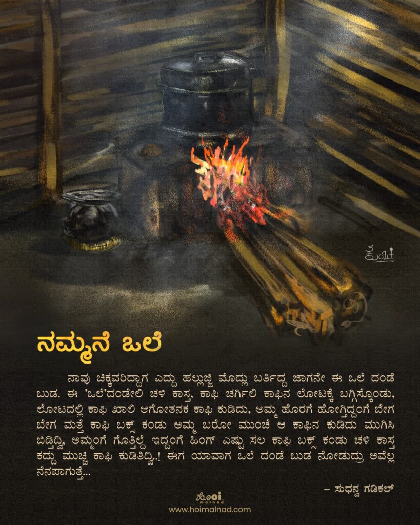 ನಾವು ಚಿಕ್ಕವರಿದ್ದಾಗ ಎದ್ದು ಹಲ್ಲುಜ್ಜಿ ಮೊದ್ಲು ಬರ್ತಿದ್ದ ಜಾಗನೇ ಈ ಒಲೆ ದಂಡೆ ಬುಡ. ಈ ‘ಒಲೆ’ದಂಡೇಲಿ ಚಳಿ ಕಾಸ್ತ, ಕಾಫಿ ಚರ್ಗಿಲಿ ಕಾಫಿನ ಲೋಟಕ್ಕೆ ಬಗ್ಗಿಸ್ಕೊಂಡು, ಲೋಟದಲ್ಲಿ ಕಾಫಿ ಖಾಲಿ ಆಗೋತನಕ ಕಾಫಿ ಕುಡಿದು, ಅಮ್ಮ ಹೊರಗೆ ಹೋಗ್ತಿದ್ದಂಗೆ ಬೇಗ ಬೇಗ ಮತ್ತೆ ಕಾಫಿ ಬಕ್ಸ್ ಕಂಡು ಅಮ್ಮ ಬರೋ ಮುಂಚೆ ಆ ಕಾಫಿನ ಕುಡಿದು ಮುಗಿಸಿ ಬಿಡ್ತಿದ್ವಿ, ಅಮ್ಮಂಗೆ ಗೊತ್ತಿಲ್ದೆ ಇದ್ದಂಗೆ ಹಿಂಗ್ ಎಷ್ಟು ಸಲ ಕಾಫಿ ಬಕ್ಸ್ ಕಂಡು ಚಳಿ ಕಾಸ್ತ ಕದ್ದು ಮುಚ್ಚಿ ಕಾಫಿ ಕುಡಿತಿದ್ವಿ..! ಈಗ ಯಾವಾಗ ಒಲೆ ದಂಡೆ ಬುಡ ನೋಡುದ್ರು ಅವೆಲ್ಲ ನೆನಪಾಗುತ್ತೆ…