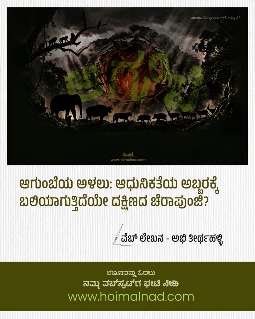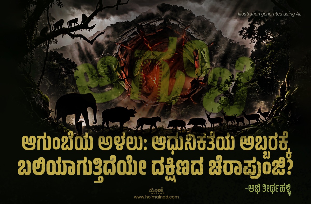 ದಕ್ಷಿಣ ಭಾರತದ ಚೆರಾಪುಂಜಿ ಹಾಗೂ ಮಲೆನಾಡಿನ ಹೆಬ್ಬಾಗಿಲು ಎಂದೇ ಹೆಸರಾಗಿರುವ ನಮ್ಮ ಆಗುಂಬೆಯ ಅಸ್ತಿತ್ವ ಇಂದು ಭೀತಿಯಲ್ಲಿದೆ. ಸೋಮೇಶ್ವರ ವನ್ಯಜೀವಿ ಧಾಮದ ನಡುವೆ ಹಾದುಹೋಗುವ ಆಗುಂಬೆ ಘಾಟಿ ರಸ್ತೆ ಕೇವಲ ವಾಹನಗಳ ಓಡಾಟಕ್ಕಿರುವ ಸಂಪರ್ಕ ಮಾರ್ಗವಲ್ಲ, ಅದು ಅಸಂಖ್ಯಾತ ಜೀವಿಗಳ ಆವಾಸಸ್ಥಾನ ಮತ್ತು ಲಕ್ಷಾಂತರ ಜನರ ಬದುಕಿನ ಆಧಾರ. ಆದರೆ, ಈ ಸೂಕ್ಷ್ಮ ಪರಿಸರದಲ್ಲಿ ಸುರಂಗ ಮಾರ್ಗ, ದ್ವಿಪಥ ರಸ್ತೆ ಮತ್ತು ಪಾದಚಾರಿ ಮಾರ್ಗ ನಿರ್ಮಿಸುವ ಹೊಸ ಪ್ರಸ್ತಾವನೆಯು ಇದೀಗ ಪರಿಸರ ಪ್ರೇಮಿಗಳನ್ನು ಮತ್ತು ಸ್ಥಳೀಯರನ್ನು ತೀವ್ರ ಕಳವಳಕ್ಕೀಡು ಮಾಡಿದೆ. ಅಭಿವೃದ್ಧಿಯ ಹೆಸರಿನಲ್ಲಿ ತರುತ್ತಿರುವ ಈ ಬೃಹತ್ ಯೋಜನೆಯು ಮುಂದೊಂದು ದಿನ ಭಾರಿ ವಿನಾಶಕ್ಕೆ ಕಾರಣವಾಗಲಿದೆಯೇ ಎಂಬ ಚರ್ಚೆ ಈಗ ಗಂಭೀರವಾಗಿ ನಡೆಯುತ್ತಿದೆ.